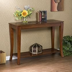 This brown cherry / slate sofa table has elegant styling bursting with character. A magnificent brown cherry finish accents the wood grain and perfectly complements the natural earth tones of the faux slate tile top. Exquisite stone texture adds an amazing rustic feel to this traditional and sophisticated piece. The slat shelf on the bottom creates added visual interest that creates an open feeling. Such a stunning table is sure to be a welcome addition to your home.