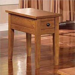Your favorite reading chair will be even cozier with the Liberty Chairside End Table in Oak alongside. This narrow end table is specifically designed to tuck right next to your recliner to provide a handy spot for a lamp and a warm beverage. The drawer is ideal for storing your book or reading glasses when not in use. A warm oak finish highlights the rustic design and beautiful wood grain of this charming table.