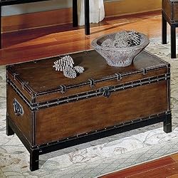 Capture the spirit of adventure and Old World Charm in your living area with the Voyage Trunk Coffee Table. This traditional trunk-style table is crafted from hardwood solids and finished in a dark brown. You'll appreciate the extra storage space afforded with this trunk. Faux-leather trim and straps on the top and sides nail head trim around the base and a flap lock on the lid add a touch of authenticity and character. Perfect for your living room your study or the foot of your bed.