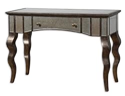 The Uttermost Almont Console Table has one pull out drawer where you can keep essential items. Place this beautifully crafted console table against any wall and watch it transform the decor of the room. It has a distressed rust bronze finish with silver champagne undertones and antiqued beveled mirror inlays. This table rests on sturdy, creatively designed legs that add to the beauty of the table. Owing to its portability it can be placed in any room.About UttermostThe mission of the Uttermost Company is simple: to make great home accessories at reasonable prices. This has been their objective since founding their family-owned business over 30 years ago. Uttermost manufactures mirrors, art, metal wall art, lamps, accessories, clocks, and lighting fixtures in its Rocky Mount, Virginia, factories. They provide quality furnishings throughout the world from their state-of-the-art distribution center located on the West Coast of the United States.